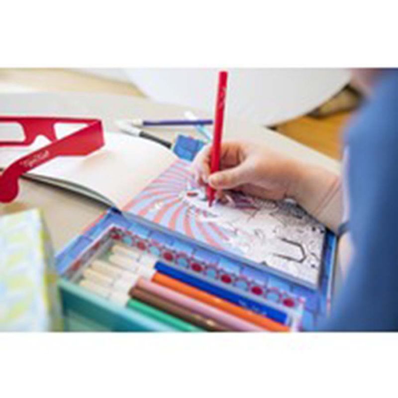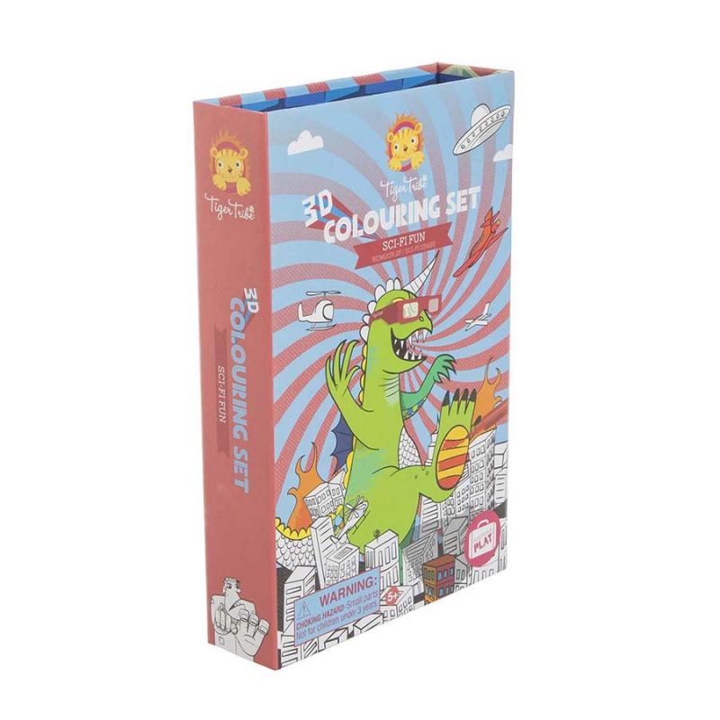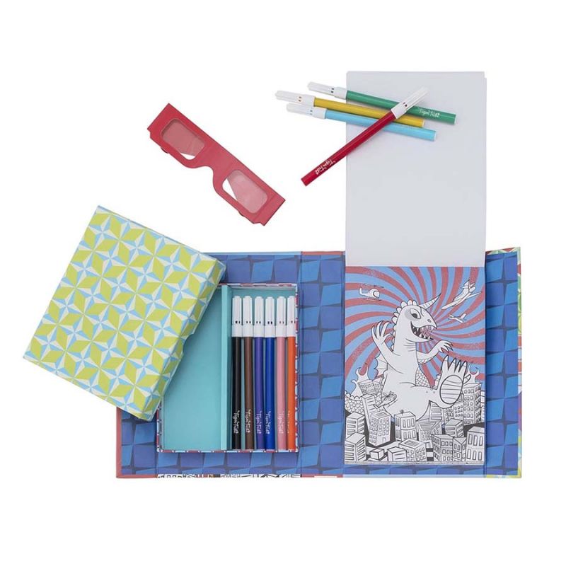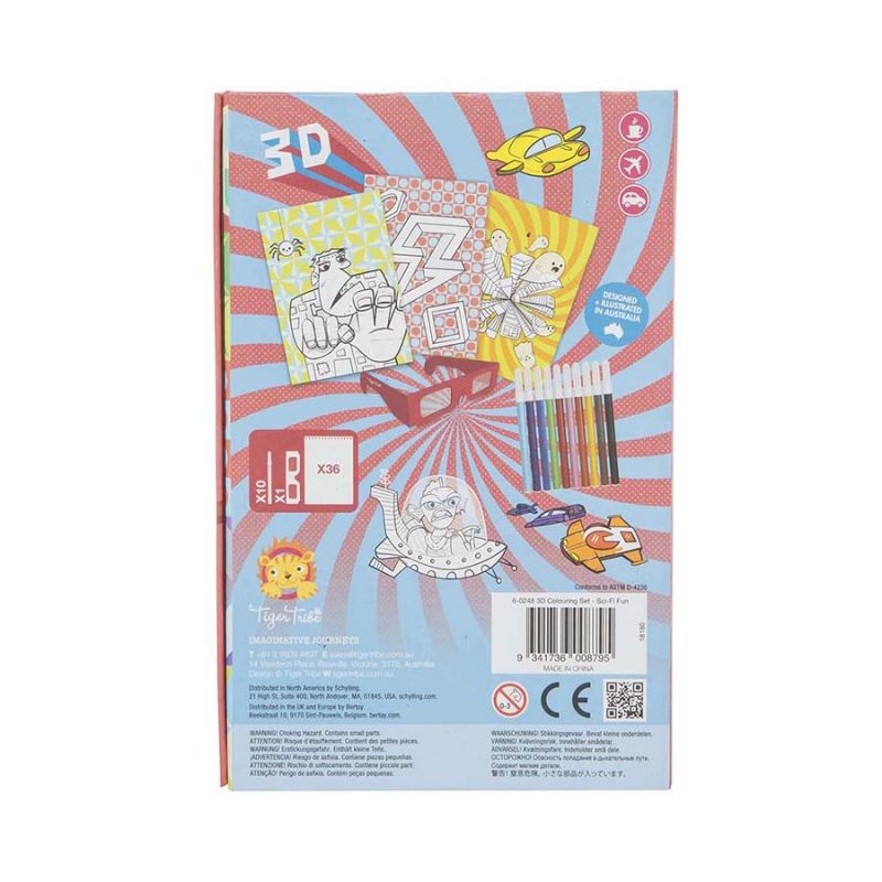 Perfect for on-the-go fun, the Tiger Tribe 3D Colouring Set Sci-Fi Fun is sure to be a hit! This set enables kids to create optical illusions. Simply colour in, pop the special 3D glasses and see the artwork come to life! This set is perfect for portable play and is full of colouring pages, coloured marks and 3D glasses. It's all packed safely in the box, with a magnetic flap to keep everything secure. The easy, fun and portable kit comes as a great alternative to screen time, whether at a cafe or travelling.