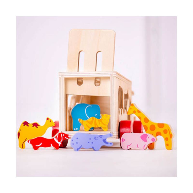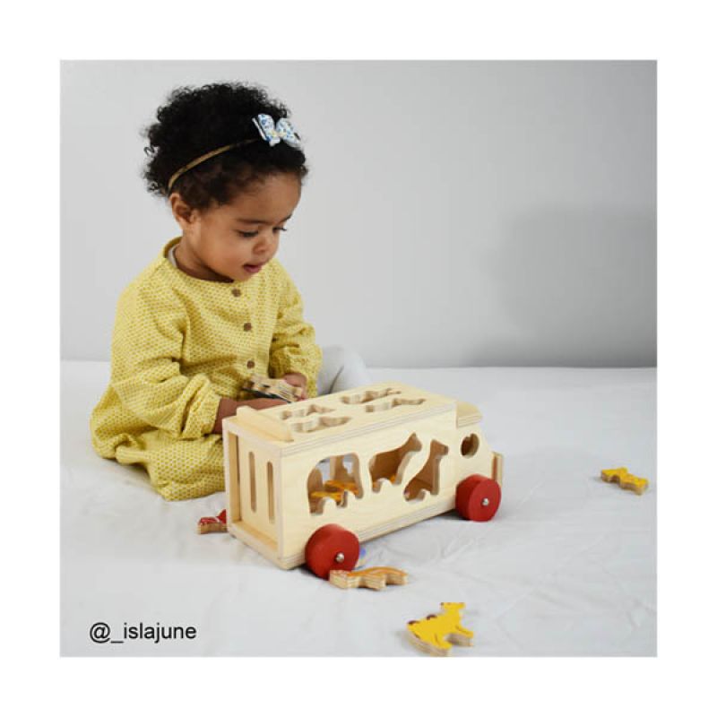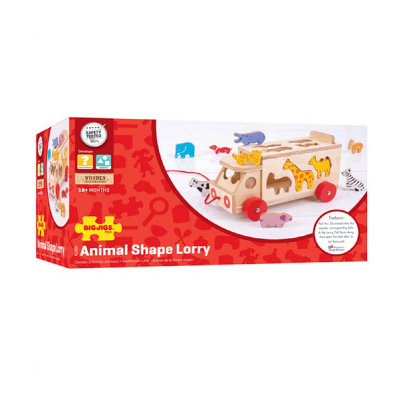 This brightly coloured pull-along wooden shape sorter comes packed with 10 vibrant wooden animals. The wooden animals can be loaded onto the lorry through special slots which helps to develop dexterity and coordination skills. Sort the shapes and learn all about animals, then slot each one through the correct slot. Once all of the animals are all safely aboard, make sure the rear tailgate is closed and then the lorry can be pulled along by the red cord! The sturdy red wooden wheels ensure this little lorry is able to be safely pulled around every room in the house. 11 play pieces, including: 1x wooden lorry, 1x giraffe, 1x dog, 1x cat, 1x hippo, 1x elephant, 1x cow, 1x zebra, 1x camel, 1x antelope and 1x pig Age: 3 Years+ Product dimensions: 7.5 x 7.5 x 26.5cm Our Animal Shape Lorry wooden shape sorter is made from high quality, responsibly sourced materials. Each of the wooden shapes are smooth and chunky, making them ideal for little fingers. Conforms to current European safety standards.