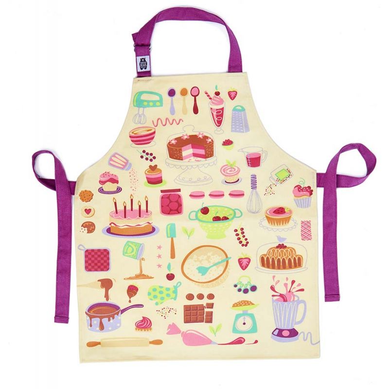 Screen printed in 9 colours, the illustrations here depict all sorts of fun baking to be had while preparing celebration cakes and pastries!! A stylish Let's Bake children's apron made with 100% cotton screen printed with illustrations of baking activities. Features; adjustable cotton ties with a double D ring and a place to personalise inside front facing. Suitable for children age 6 - 8 years. Product dimensions: 42 x 49 cms