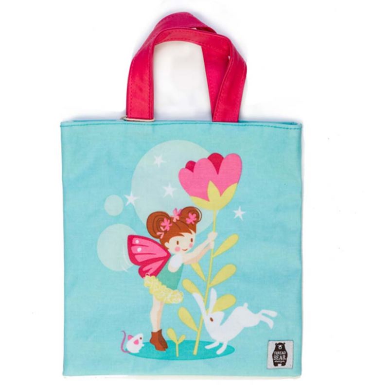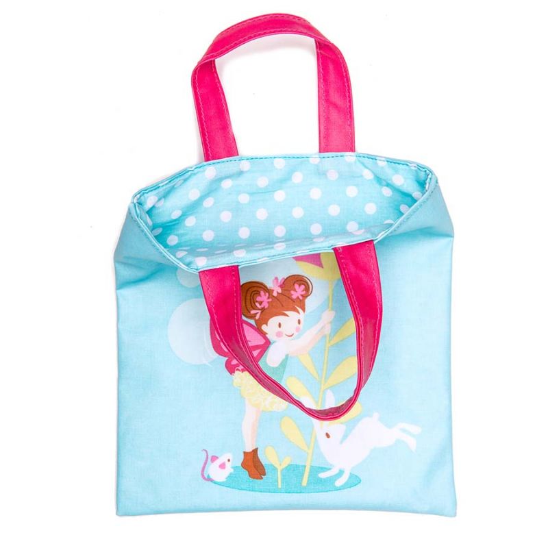Our very own Trixie the Pixie is illustrated front and back of this cute little tote bag and will hold a dolly, some bracelets, lots of pencils and maybe some chocolate! A delightful little tote bag made from TPU coated cotton and illustrated with our lovely little fairy. Bag is lined with pink and white spotty fabric. TPU is a biodegradable coating, making this an Earth Friendly product! Wipe clean. Measures 22cms by 23 cms