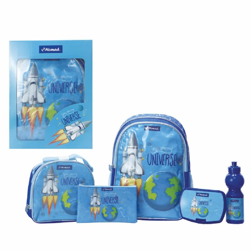 تعرض كل قطعة في مجموعة Universe بفخر رسالة "You are my UNIVERSE" وعلامة Nomad التجارية الشهيرة. دع مستكشفك الصغير يصل إلى النجوم مع هذه المجموعة المدرسية الكاملة والآسرة!