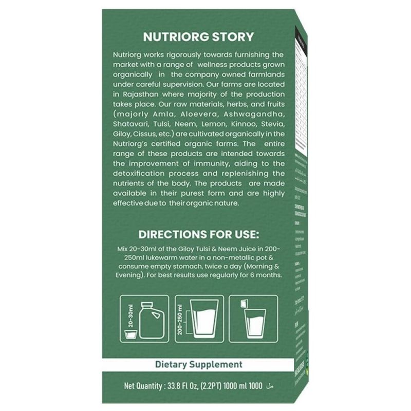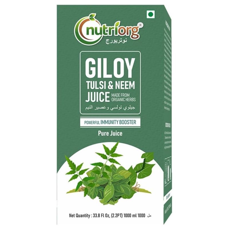 عصير Nutriorg Giloy طبيعي 100٪ ومستخرج من Giloy العضوي المزروع في مزارع عضوية معتمدة. يمتلك جيلوي ونيم وتولسي العديد من الخصائص التي تعزز المناعة.