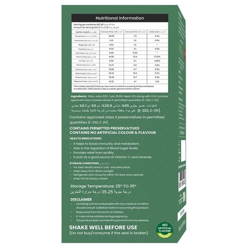 إنها قوة من مضادات الأكسدة التي تحارب الجذور الحرة وتحافظ على صحة الخلايا. يساعد جيلوي والنيم في إزالة السموم. جيلوي مفيد جدا في تحسين الهضم والتعامل مع القضايا المتعلقة بالأمعاء. يساعد في تقليل التوتر العقلي. النيم يحفز الجهاز المناعي ويشجع على الشفاء السريع.