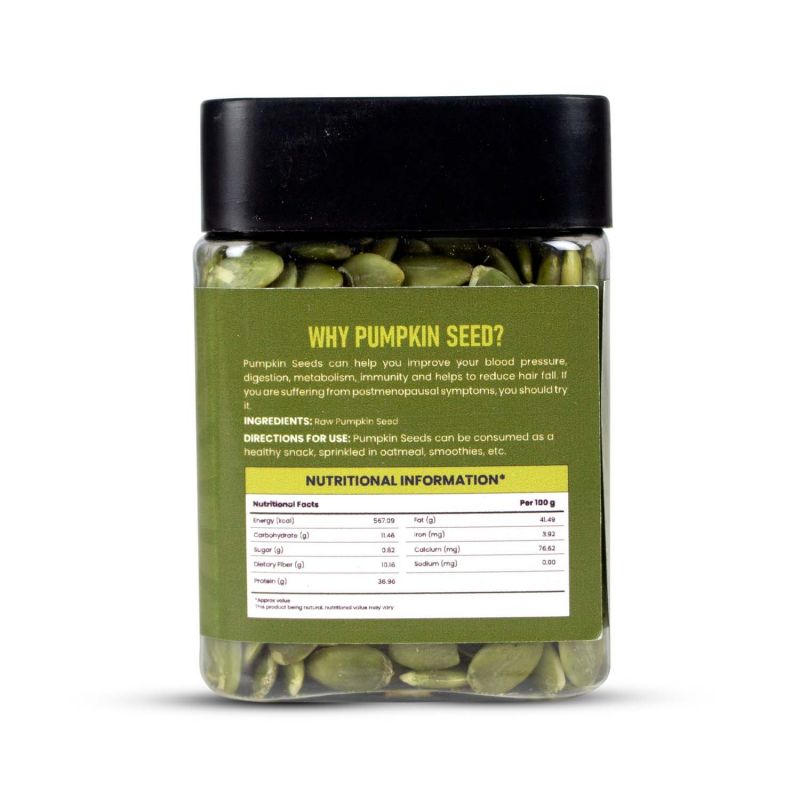 بذور اليقطين Nutriorg طبيعية 100٪. تحتوي بذور اليقطين على العناصر الغذائية الأساسية مثل البروتين والألياف الغذائية والأحماض الدهنية الغنية بالأوميغا والفوسفور والمغنيسيوم. كل هذه العناصر الغذائية ضرورية لحياة صحية ورفاهية. بذور اليقطين هي مصدر جيد للزنك والنحاس والحديد ، والتي يمكن أن تقلل من تساقط الشعر ، وتحسن صحة الجلد ، وتحمي صحة القلب. فهي غنية بالعديد من مضادات الأكسدة ، والتي يمكن أن تساعد في الحماية من تلف الخلايا ودعم صحة المفاصل. محتوى البوتاسيوم والمغنيسيوم والأحماض الدهنية الغنية بالأوميغا في بذور اليقطين يقلل من الكوليسترول السيئ وينظم ضغط الدم ، وبالتالي يحسن صحة القلب. تحتوي بذور اليقطين الخام على معظم الألياف والدهون غير المشبعة. بذور اليقطين غنية بالبروتين والمعادن والألياف الغذائية في حين أنها منخفضة السعرات الحرارية والصوديوم ، مما يجعلها صحية للغاية ، وتعزيز إدارة الوزن وتقوية العضلات. تجعل بذور اليقطين وجباتنا صحية ومغذية مع إضافة نكهتها الفريدة وقرمشتها. تساعد الألياف العالية في بذور اليقطين على الهضم وتجعلك تشعر بجوع أقل طوال اليوم ، وبالتالي تمنع الإفراط في تناول الطعام طوال اليوم.