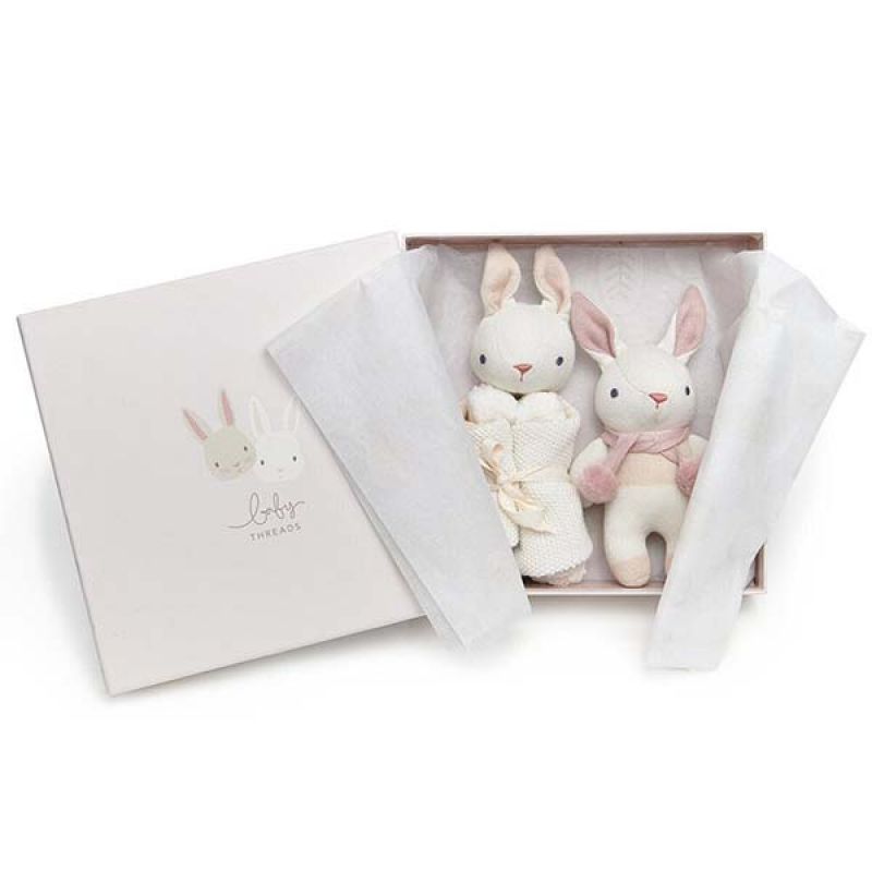 Designed and made by ThreadBear Design Looking for that perfect baby gift? This wonderfully soft bunny gift set is a great present for any new born baby. Presented in an illustrated colour gift box, this knitted toy set is soft to touch and cuddly for little children. The comforter is complete with a linen panel and pretty pom poms, and the little bunny toy has a gentle rattle inside to amuse babies with its sound. Suitable from birth. Product size: 26 x 26 x 6cm (Box Size)