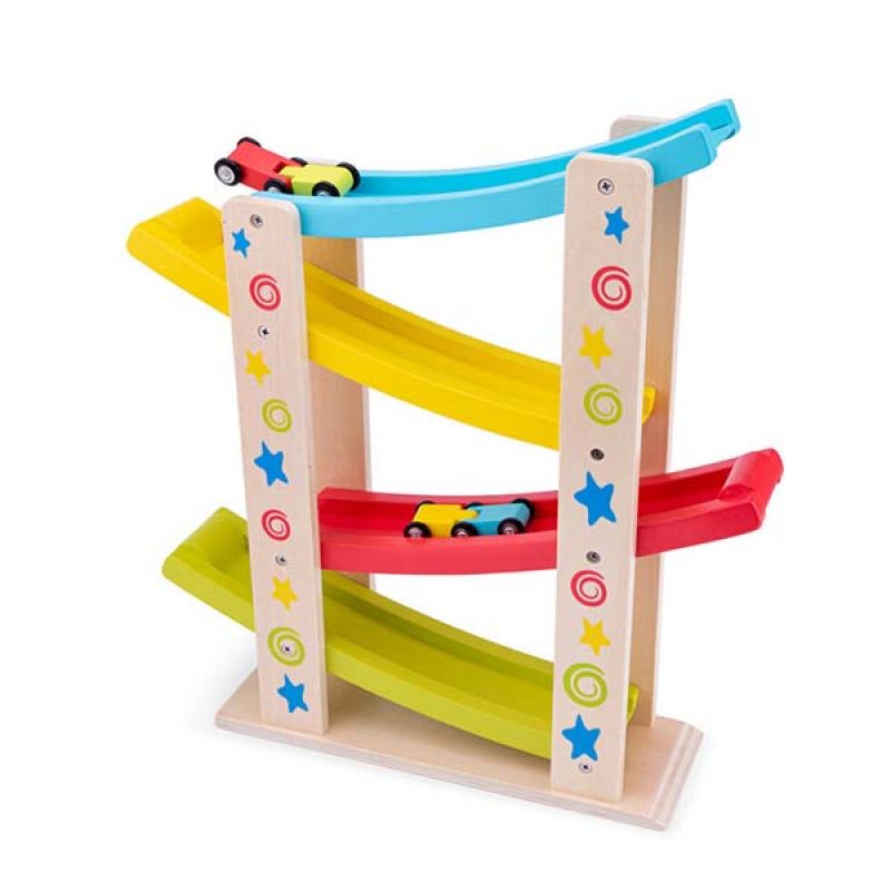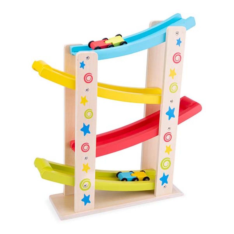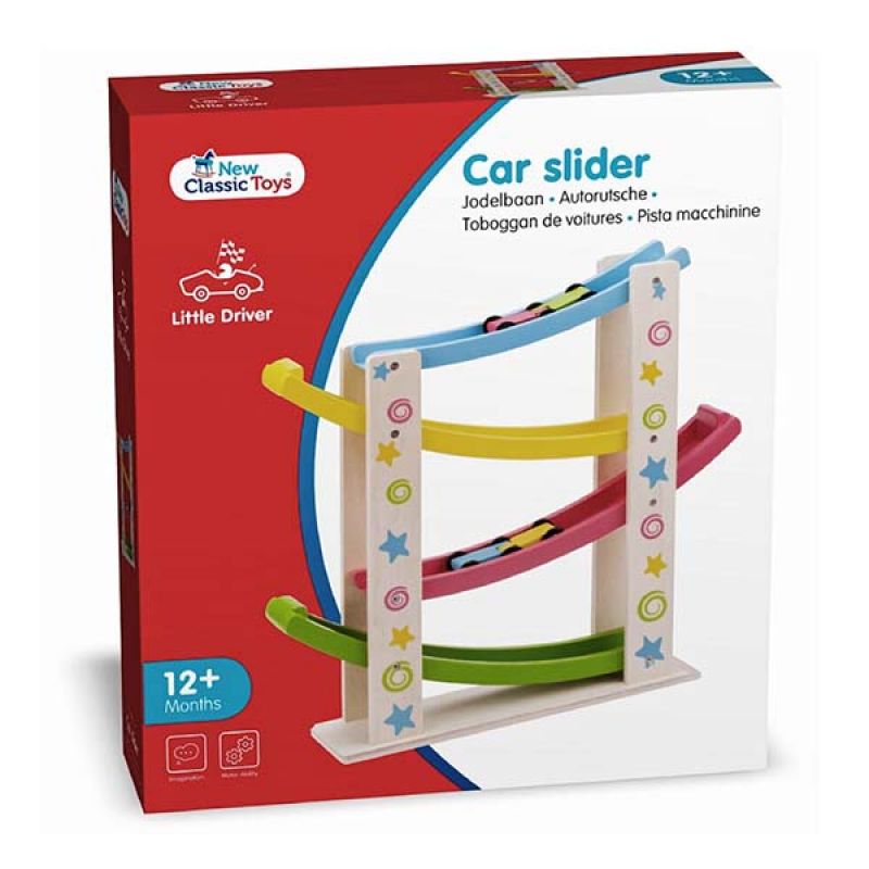 Little ones will love this brightly coloured wooden car slider by New Classic Toys. Put one of the three wooden cars included at the top of the slider and it will roll down flipping onto the next level as it reaches the end of each of the coloured slopes. This Star Car Slider is beautifully decorated with vibrant stars and spirals to match the colours of the slopes. Fantastic fun toy that will provide many hours of play in addition to developing hand eye coordination. Age: 18 Months+ Dimensions: 36 x 9.5 x 40cm New Classic Toys offers a range of toys and toy-related products that contribute to a positive development of a child. All New Classic Toys products meet the safety requirements according to the EN-71 standard. We carefully selected the collection of fair and sustainable materials. New Classic Toys stands for quality, reliability and excellent service.