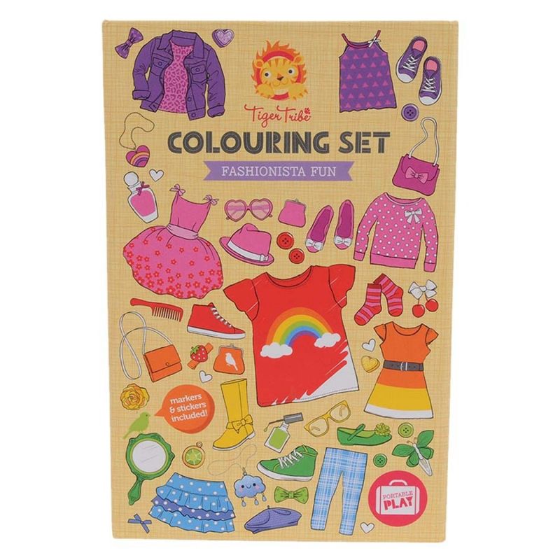 Little fashionistas will love this gorgeous colouring set from Tiger Tribe. Packed full of glamour, there are 48 colouring pages to decorate with the 10 marker pens and stickers provided in this set Each set contains: 48 colouring-in pages handy storage box 5 sheets of gorgeous full-colour stickers 10 quality markers The storage box packaging for this creative activity set has been specially designed with storage compartments to keep stationery and artwork safe, making it perfect for portable, no-mess and no-fuss play, great for cafe play and travelling. Product Dimension : 13.2x3.5x21cm Age: 3 Years +