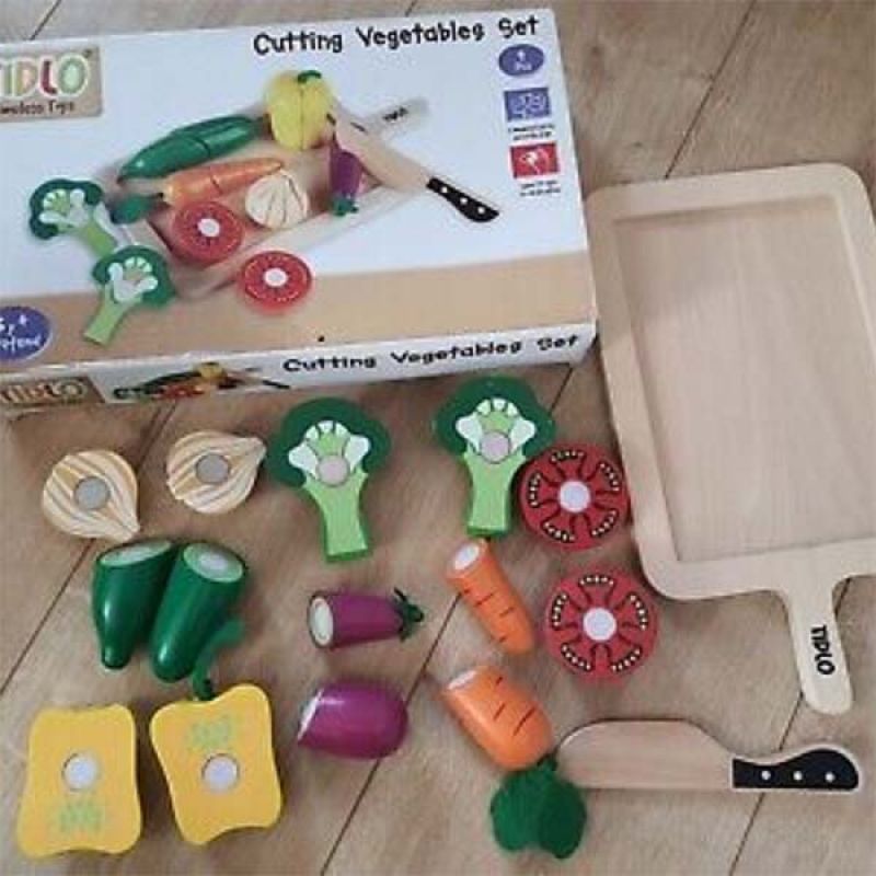 Are you getting your five-a-day? These chunky wooden play food vegetables are ideal for pretend play. The vegetables stick together with velcro and come supplied with a wooden tray and knife. Kids can slice the colourful vegetables on the chopping board with a wooden knife. With details like the real things, this set of wooden play food is great for any budding young chef or shopkeeper. A fun way to teach children about kitchen safety. Cutting Vegetables Set includes: Broccoli Pepper Carrot Eggplant Tomato Garlic Wooden tray with knife Tidlo wooden play food is ideal to help your little one learn about the importance of a healthy and balanced diet, where our food comes from and how we prepare our meals. Encourages creative and imaginative role play. Age: 3 Years+ Product dimensions: 18 x 31.5 x 1.25cm Made from high quality, responsibly sourced materials. Conforms to current European safety standards.