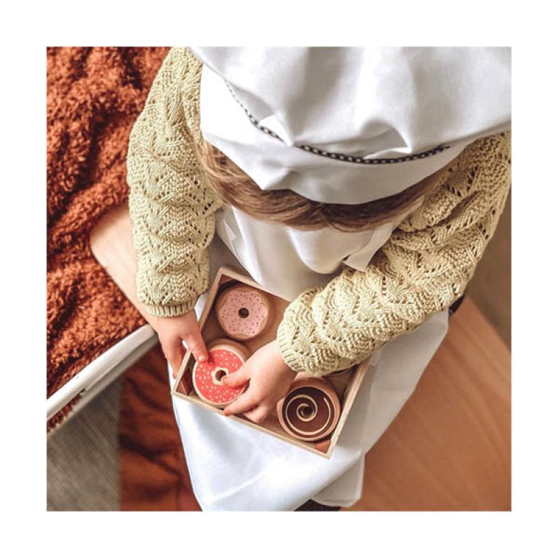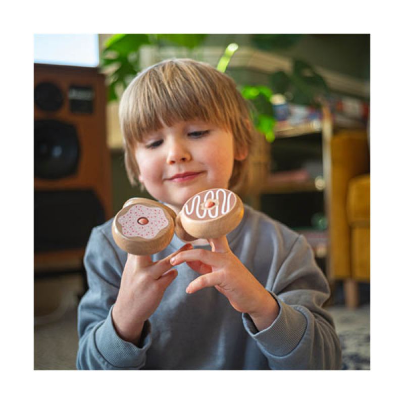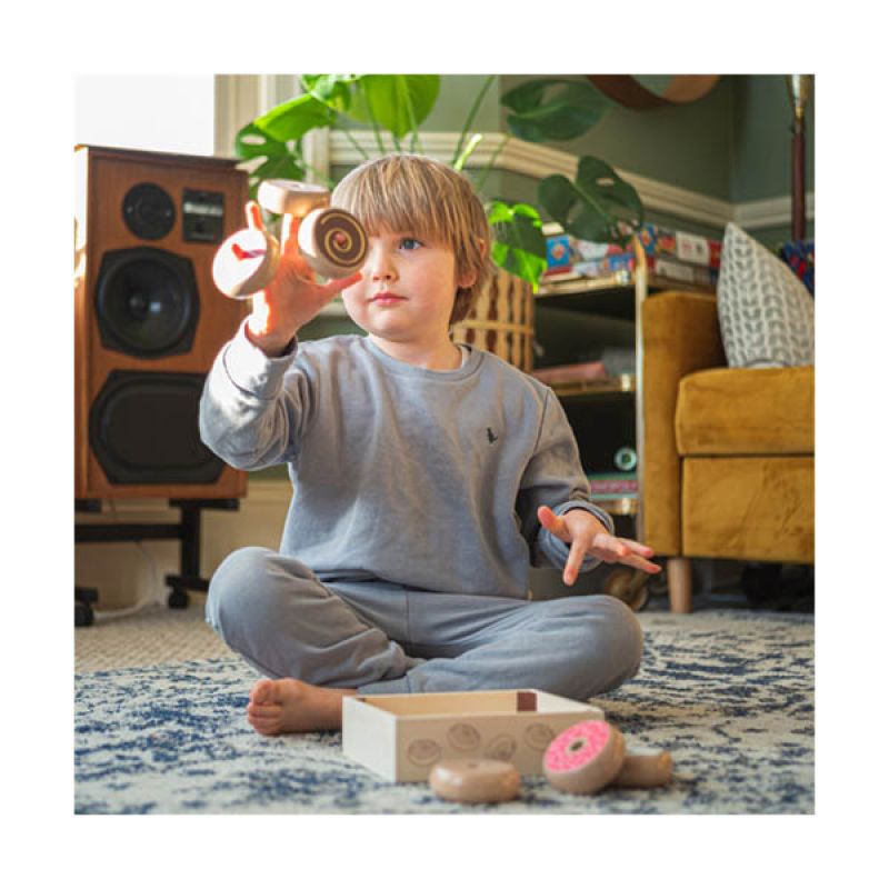 Tuck into a delicious crate of wooden doughnuts! A yummy addition to any toy food kitchen, our doughnut wooden play food is perfect for sharing! Helps with fostering imaginative play and builds social and language skills. This wooden play food is ideal for introducing the concept of choice and sharing, and great for tea parties! These wooden doughnut food toys are made from smooth, high-quality sustainably sourced wood. They come neatly packed in a wooden crate for easy, safe storage. The bright icing colours are produced from child-friendly paints and lacquers so are safe for little hands (and mouths!) to play with. Age: 18 Months+ Product dimensions: 18 x 14.5 x 5cm Made from high quality, responsibly sourced materials. Coated in non-toxic paints and lacquers. Conforms to current European safety standards.