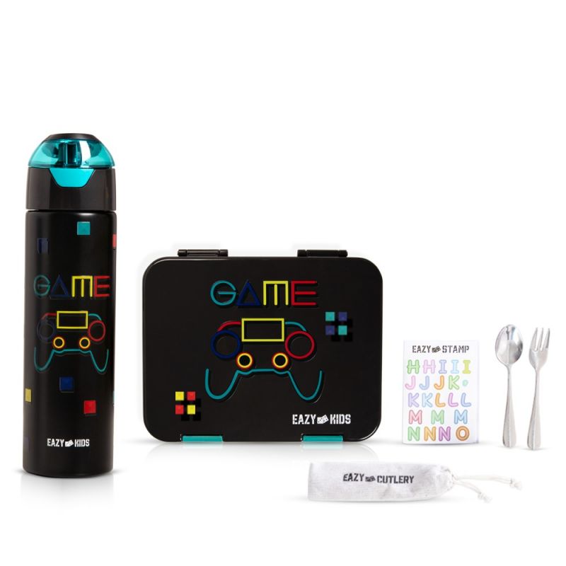 Eazy Kids 6 & 4 Convertible Bento Lunch Box w/ Water Bottle, Steel Spoon & Fork Set and Alphabets Sticker - Gamer