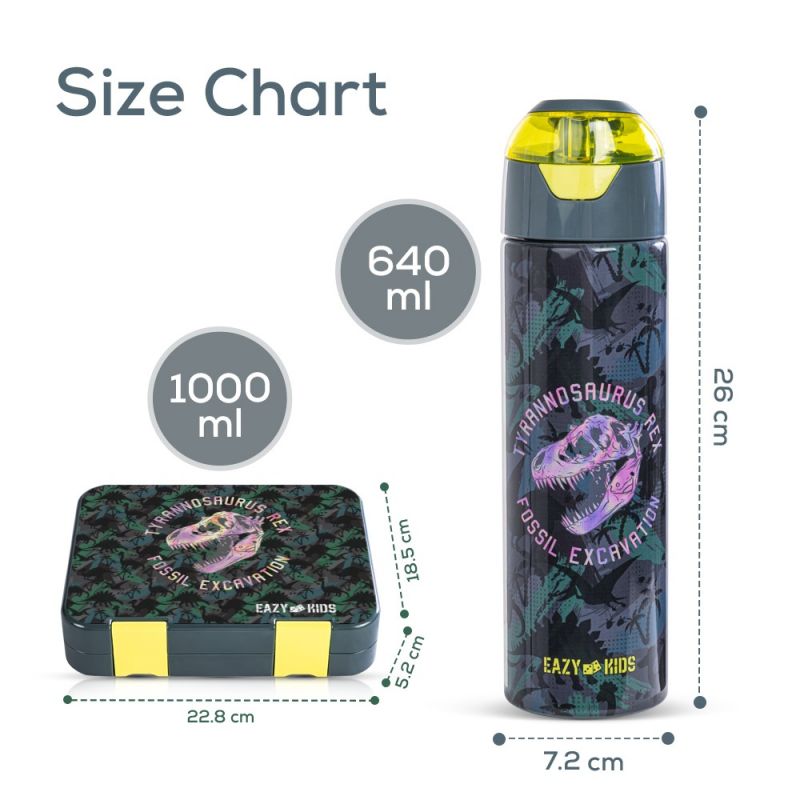 Eazy Kids 6 & 4 Convertible Bento Lunch Box w/ Water Bottle, Steel Spoon & Fork Set and Alphabets Sticker - T-Rex dino Grey
