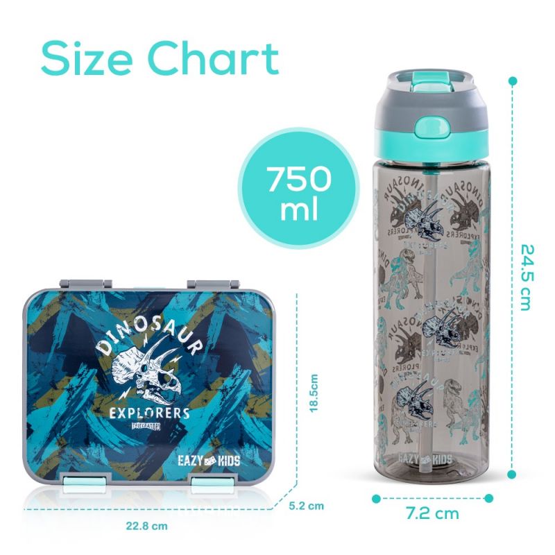 Eazy Kids 6 & 4 Convertible Bento Lunch Box w/ Water Bottle, Steel Spoon & Fork Set and Alphabets Sticker - T-Rex Grey