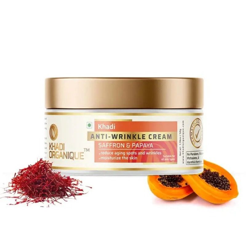 //php include('more-sellers.php'); ?>KHADI ORGANIQUE SAFFRON PAPAYA ANTI-WRINKLE CREAM offers triple action formula that reduces premature aging spots, diminishes the appearance of wrinkles and moisturizes the skin with its regenerative boost. Helpful for stimulation the growth of new tissue and new skin, thus promoting a clearer, brighter, evenly toned complexion for youthful and glowing skin.