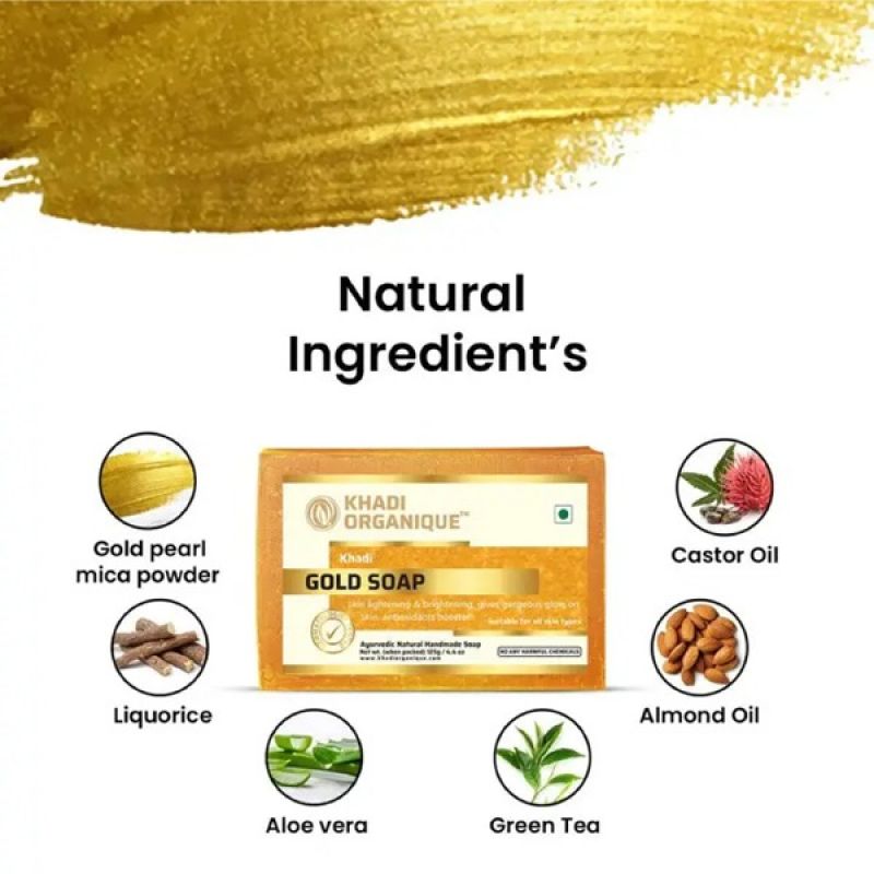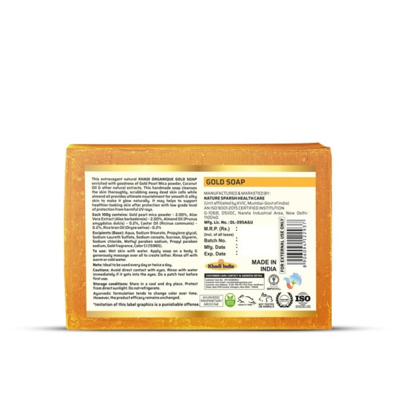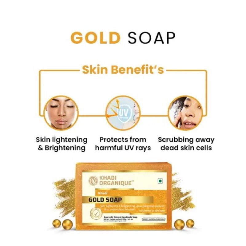 Purpose of Product:Khadi Organique Gold Soap aims to protect the skin from UV damage, fade scarring, brighten the complexion, and promote healthier-looking skin.