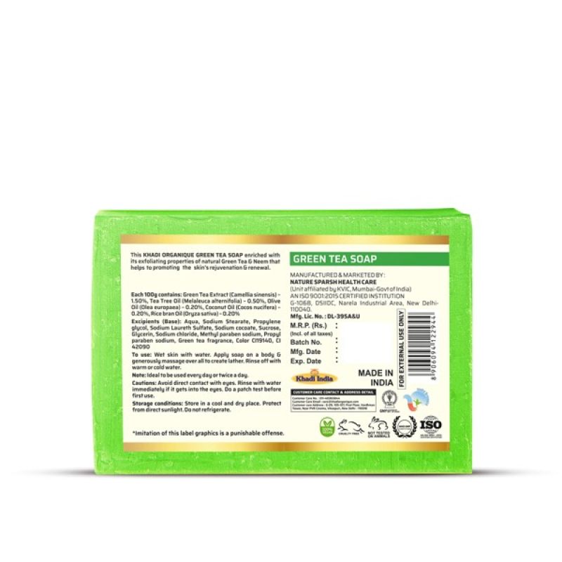 Product Description (EN):Experience the refreshing and rejuvenating properties of Khadi Organique Green Tea Soap, enriched with natural Green Tea and Neem for exfoliating and anti-aging benefits. This soap helps diminish the signs of aging, eliminates dead skin, dirt, bacteria, and other pollutants from the skin’s surface, and diminishes the appearance of cellulite, promoting skin rejuvenation and renewal. Targeting a skincare routine to counteract cellular damage, this handmade ayurvedic soap reinforces your skin's natural ability to defend itself.