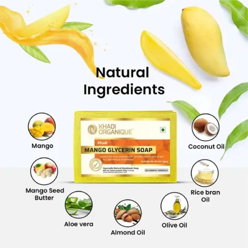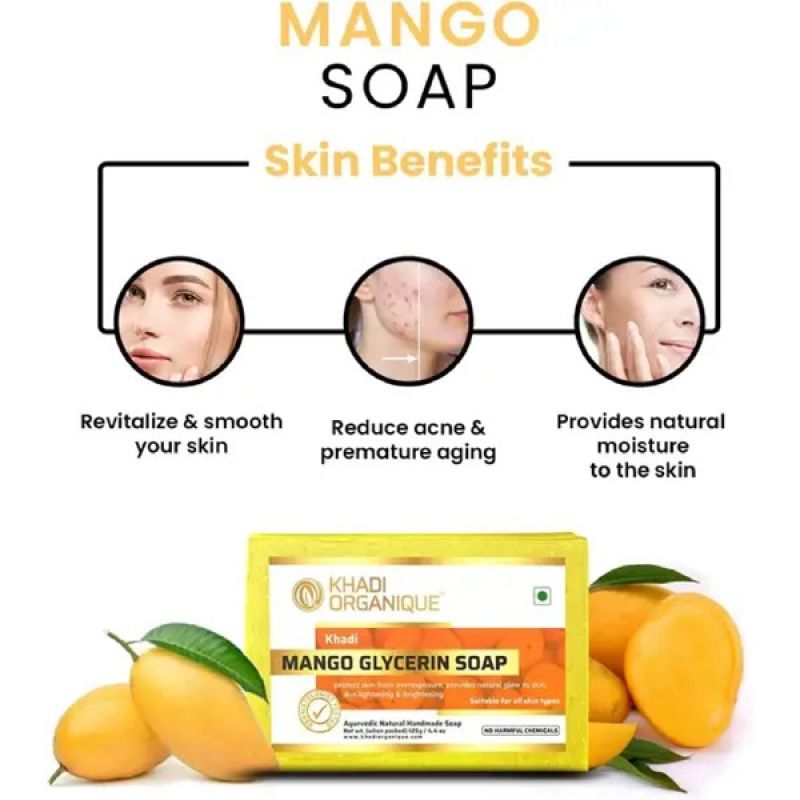 //php include('more-sellers.php'); ?>This natural handmade KHADI ORGANIQUE MANGO GLYCERIN SOAP has antioxidants that help in preventing blockages; breakouts and acne to give you super fresh & moisturized skin throughout the day. This soap contains natural sources of Vitamin A & C which helps to balance sebum, protects from sun damage, & banishes signs of aging like lines & wrinkles. Mango seed butter helps to protect the body from free radicals that damage the skin & induce premature aging for restoring its youthfulness.
