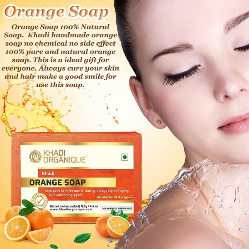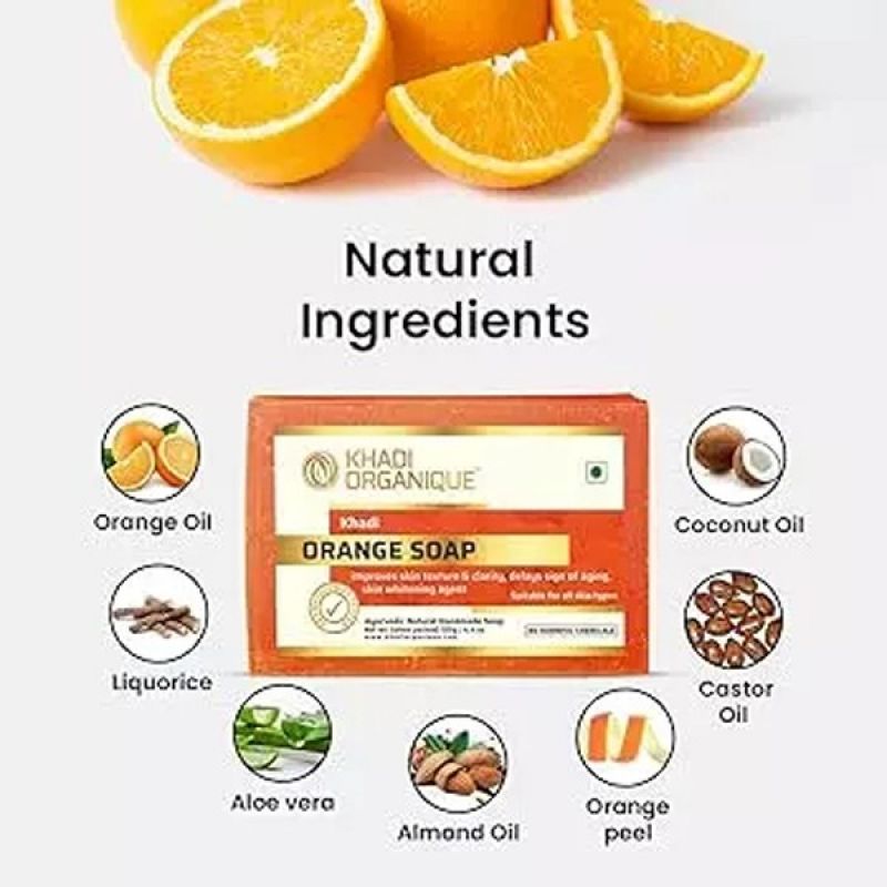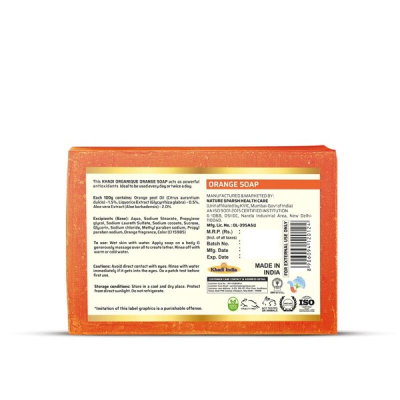 Product Description (EN):Unleash the power of antioxidants with Khadi Organique Orange Soap, designed to keep away many infection-causing microbes. Enriched with natural bleaching agents, this soap lightens dark blotches on the skin and reduces suntans by deflecting harmful UV rays. It helps in restoring collagen in your body, responsible for skin firming, and prevents premature aging of the skin.