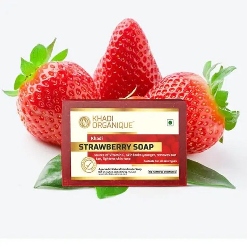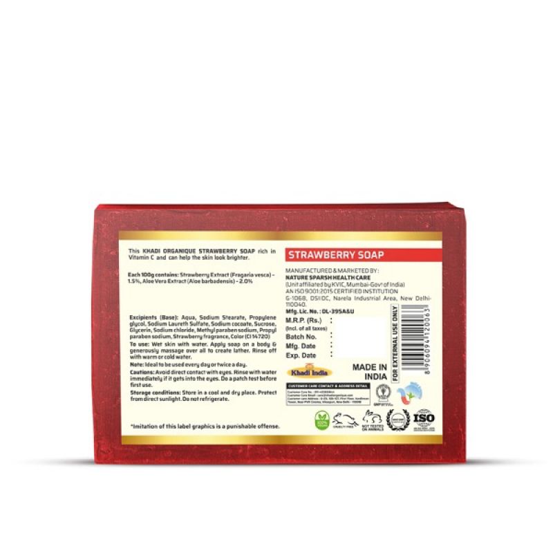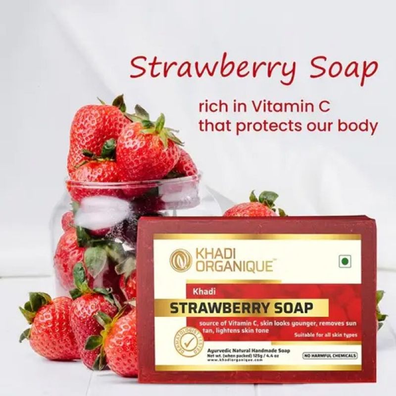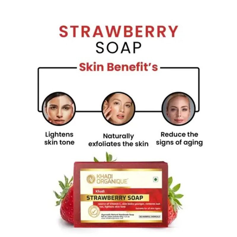 Product Description (EN):Indulge in the luxurious goodness of Khadi Organique Strawberry Soap, derived from the king of flowers, rosewater. This soap effectively removes oil and dirt from your skin by unclogging pores and restoring the natural pH balance. With its antiseptic and astringent properties, it helps heal scars, moisturizes the skin, defends against pimple-causing germs, strengthens skin cells, and regenerates skin tissues for a glowing complexion. It keeps the skin healthy and vibrant, making dull skin look more fresh and radiant, while also nourishing and softening the skin. Additionally, it provides anti-aging benefits.