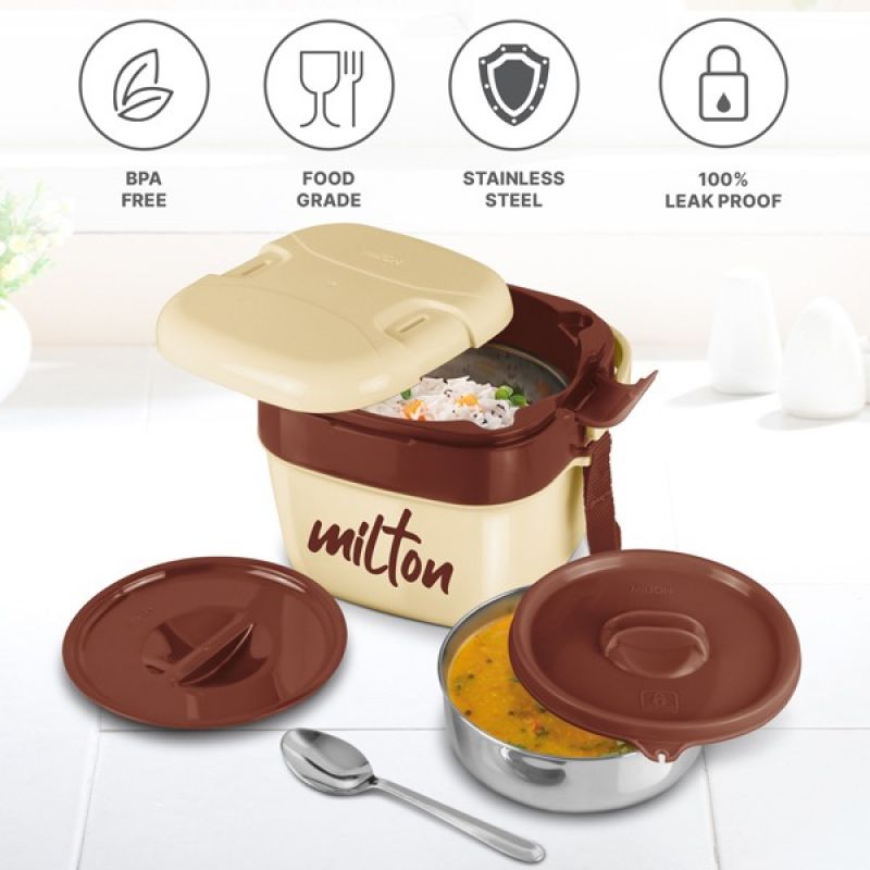 Milton Cubic Insulated Lunch Box by SAMBOX has Inner Stainless Steel Which Keeps Food Warm and Fresh for Hours. The Tiffin Is Made Of Food Grade Material And Stainless Steel Inner. A Separate Small Stainless Steel Leak Proof Container for Dry & Wet Food along with Steel Spoon. Ideal Lunch Carrying Solution for Everyday Use. Carrying your own home - cooked food to office is both a delicious way of consuming your daily meals. The Milton tiffin box is a great solution for carrying these meals in a stylish package. This set helps keep your meals warm when you are on the go. Create fun filled Nutritious Lunches for your kids during this Back to School Season or office going people.