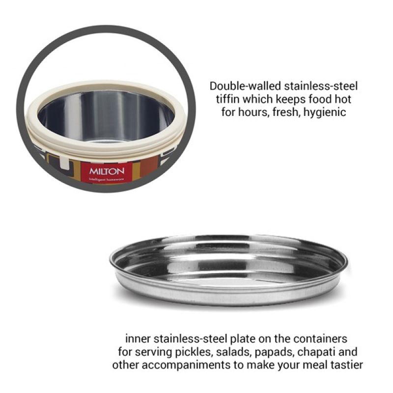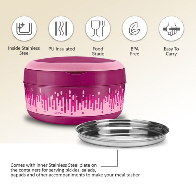 Milton Small Bite Tiffin by SAMBOX is a double - walled stainless - steel tiffin. Double Walled Insulated tiffin box which keeps your food hot & fresh for hours. This tiffin container is made up of durable plastic material with inner steel body, it is BPA Free and safe for regular usage. This lunch box allows you to carry food easily, Great size for a hearty meal while leaving room for snacks or a dessert. It comes with an inner stainless - steel plate on the containers for serving pickles, salads, papads, chapati and other accompaniments to make your meal tastier. The cutting - edge contemporary design and attractive body - graphics makes this one look really cool. This container is appropriate for storing dry fruits, pulses, food, and spices. Ideal for gifting and self - use. The Milton tiffin box is a great solution for carrying these meals in a stylish package. This Lunch Box helps keep your meals warm when you are on the go. Create fun filled Nutritious Lunches for your kids during this Back to School Season.