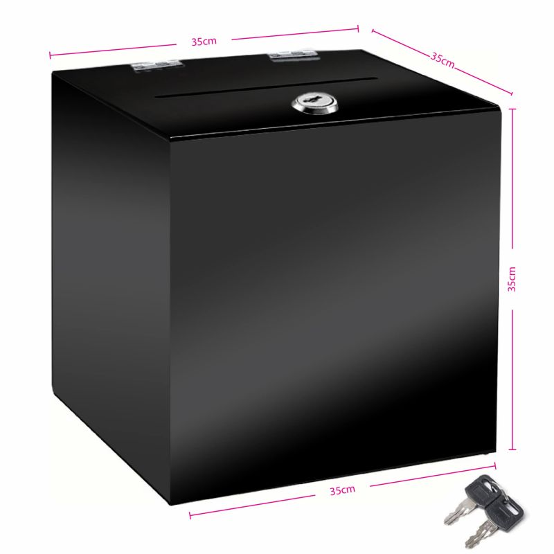 ലോക്ക് (35 സെന്റിമീറ്റർ) ഉള്ള ബ്ലാക്ക് അക്രിലിക് സീക്രട്ട് ലക്കി ഡ്രോ ബോക്സ് സുരക്ഷ , സ്വകാര്യത, ചാരുത എന്നിവയുടെ മികച്ച സംയോജനമാണ് - റാഫിളുകൾ, മത്സരങ്ങൾ, ഭാഗ്യ നറുക്കെടുപ്പുകൾ, സംഭാവനകൾ അല്ലെങ്കിൽ രഹസ്യ വോട്ടിംഗ് എന്നിവയ്ക്ക് അനുയോജ്യമാണ്. ഉയർന്ന ഗ്രേഡ് അതാര്യമായ കറുത്ത അക്രിലിക്കിൽ നിന്ന് രൂപകൽപ്പന ചെയ്ത ഈ ബോക്സ് പൂർണ്ണമായ വിവേചനാധികാരം ഉറപ്പാക്കുന്നു, ആധുനികവും പ്രൊഫഷണൽ സൗന്ദര്യാത്മകവുമായ നിലനിർത്തുമ്പോൾ എൻ ട്രികളോ സംഭാവനകളോ മറച്ചുവയ്ക്കുന്നു.