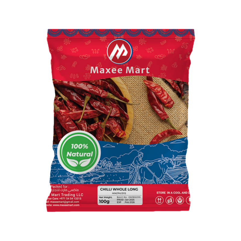 മാക്സി മാർട്ട് ഹോൾ റെഡ് മുളക് വെയിലത്ത് ഉണങ്ങിയതും പ്രകൃതിദത്തവുമായ ചൂട് നിറഞ്ഞതുമാണ്. പായസം, കറികൾ, സുഗന്ധവ്യഞ്ജന മിശ്രിതങ്ങൾ എന്നിവ വർദ്ധിപ്പിക്കുന്നതിന് അനുയോജ്യമായ അവ പരമ്പരാഗത ഇന്ത്യൻ, മിഡിൽ ഈസ്റ്റ് വിഭവങ്ങൾക്ക് ആധികാരിക സ്വാദ് നൽകുന്നു. പ്രിസർവേറ്റീവുകളോ കൃത്രിമ നിറങ്ങളോ ചേർത്തിട്ടില്ല.