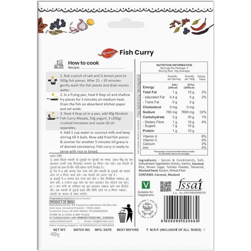 സുഗന്ധവ്യഞ്ജനങ്ങളും മസാലകളും, ഉപ്പ്, നിർജ്ജലീകരണം സംഭവിച്ച പച്ചക്കറികൾ (ഉള്ളി, വെളുത്തുള്ളി), തേങ്ങ, അരി, ബ്രൗൺ ഷുഗർ, തക്കാളി പൊടി, പുളി, കടുക് വിത്ത്, കൊക്കം, ഗോതമ്പ് ഫൈബർ
