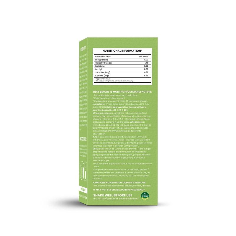 //php include('more-sellers.php'); ?>ഗോതമ്പ് പുല്ല്, ഗിലോയ്, തുളസി എന്നിവ ഉൾപ്പെടുന്ന ഔഷധസസ്യങ്ങളുടെ അത്ഭുതകരമായ സംയോജനമാണ് ന്യൂട്രിയോർഗ് ഗോതമ്പ് ഗ്രാസ് ജ്യൂസ്. ഗോതമ്പ് പുല്ല് വിഷാംശം ഇല്ലാതാക്കാനും രോഗപ്രതിരോധ ശേഷി ശക്തിപ്പെടുത്താനും മലബന്ധം തടയാനും സഹായിക്കുന്നു. ഗോതമ്പ് പുല്ല് തൽക്ഷണം രക്തപ്രവാഹത്തിലേക്ക് ആഗിരണം ചെയ്യപ്പെടുകയും ഉടനടി ഊർജ്ജം നൽകുന്നതായി കണക്കാക്കപ്പെടുകയും ചെയ്യുന്നു. തുളസി ശക്തമായ ആന്റിഓക്സിഡന്റാണ്, പ്രതിരോധശേഷി വർദ്ധിപ്പിക്കാൻ ജിലോയ് ജ്യൂസ് സഹായിക്കുന്നു. ധാരാളം ധാതുക്കളും വിറ്റാമിൻ ഉള്ളടക്കങ്ങളും ഉള്ളതിനാൽ ന്യൂട്രിയോർഗ് ഗോതമ്പ് പുല്ല് ജ്യൂസ് ഫലപ്രദമായ രോഗശാന്തിയാണ്. ജ്യൂസിൽ ഏകദേശം 70% ക്ലോറോഫിൽ അടങ്ങിയിട്ടുണ്ട്, ഇത് ഒരു പ്രധാന രക്ത ജനറേറ്ററാണ്. ഹീമോഗ്ലോബിൻ ഉത്പാദനം ത്വരിതപ്പെടുത്താൻ ഗോതമ്പ് പുല്ല് സഹായിക്കുന്നു.