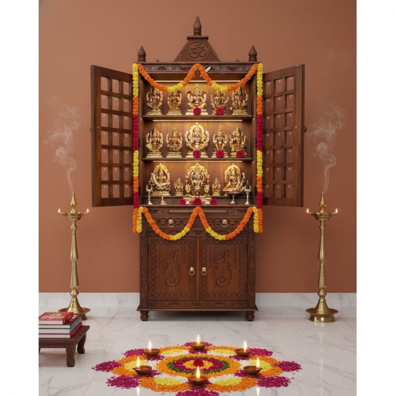 200 x 90 x 40 സെന്റിമീറ്റർ ഘടന ധൂപബോക്സുകൾ, എണ്ണ പാത്രങ്ങൾ, പ്രാർത്ഥനാ പുസ്തകങ്ങൾ, ആക്സസറികൾ എന്നിവയ്ക്കായി വിശാലമായ ഡിസ്പ്ലേ ഏരിയയും സംഭരണ വിഭാഗങ്ങളും നൽകുന്നു. കൊത്തുപണി ചെയ്ത വിശദാംശങ്ങളും മിനുസമാർന്ന മിനുക്കിയ ഫിനിഷും നിങ്ങളുടെ വീട്, ധ്യാനമുറി അല്ലെങ്കിൽ പ്രാർത്ഥനാ സ്ഥലം എന്നിവയിലെ ദിവ്യ അന്തരീക്ഷത്തെ മെച്ചപ്പെടുത്തുന്നു.