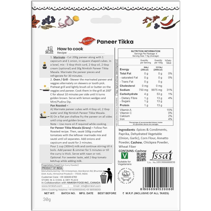 A) Marinate paneer cubes with (4 tbsp) 55ml oil, 30ml water and 30g Nimkish Paneer Tikka Masala.