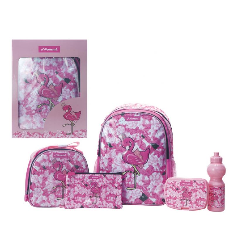 Hey there! Let me introduce you to the Nomad Primary Backpack 16" 5in1 Flamingo School Bag, the perfect companion for your child's school adventures. Imagine the joy on their face as they step into the school with this vibrant and delightful flamingo-themed backpack. It's not just a bag; it's a bundle of happiness wrapped in a floral paradise!