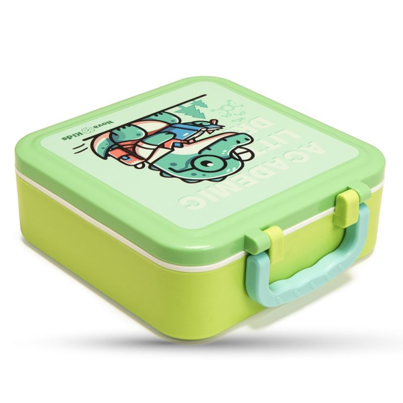 Nova Kids 3 Compartment Bento Lunch Box w/Spoon & Fork Set and Stainless Steel Gravy Box - Dino Green