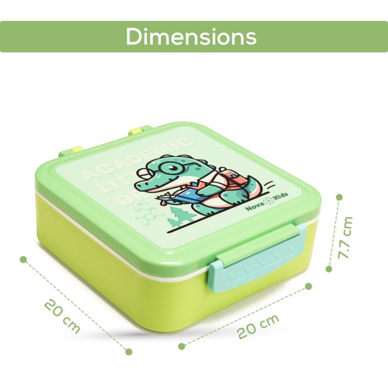 Make mealtimes fun, organized, and mess-free with the Nova Kids 3 Compartment Bento Lunch Box! Thoughtfully designed for school-going kids, this lunch box features three spacious compartments, a built-in spoon and fork set, and a separate stainless steel food jar—perfect for keeping dry and wet foods neatly separated. With a sleek square shape and 1500ml capacity, it's the perfect size to pack a balanced and comes with a grab handle. Crafted from food-grade, BPA-free plastic, this lunch box is microwave and dishwasher safe, ensuring safety and convenience for everyday use. The lid comes with a silicone lining for a leakproof seal, while the stainless steel gravy box is equipped with a vacuum valve, preventing spills and locking in freshness. The single clasp-lock closure and sturdy handle make it super easy for kids to open, close, and carry around. Specifications: Product Weight(kg): 0.597 Packing Weight(kg): 0.597 Product Dimensions(cm): 20*20*7.5 Packing Dimensions(cm): 20*20*7.5 Capacity : 1.5L Material: PP+ Stainless Steel+ Silicone What’s Included: 1* Nova Kids 3 Compartment Bento Lunch Box 1* Spoon & Fork Set 1* Stainless Steel Jar