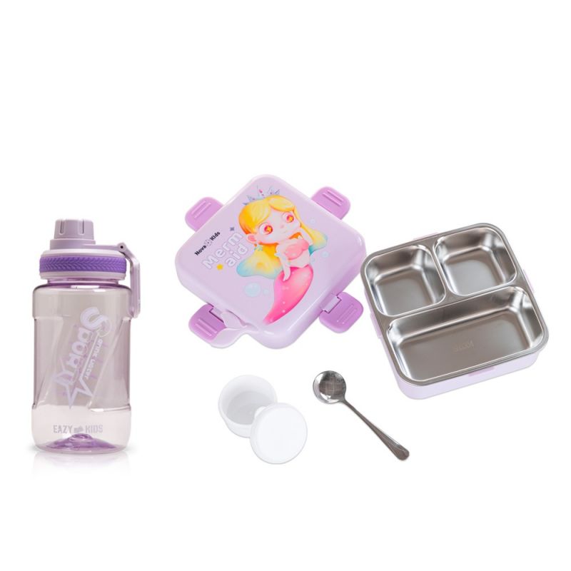 Nova Kids Stainless Steel 3 Compartment Bento Lunch Box w/ Water Bottle, Spoon and Sauce Box - Mermaid Purple