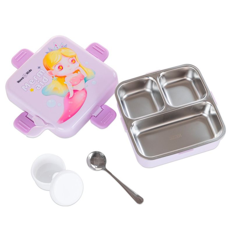 Nova Kids Stainless Steel 3 Compartment Bento Lunch Box w/Spoon and Sauce Box - Mermaid Purple