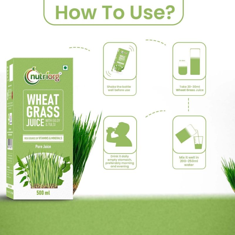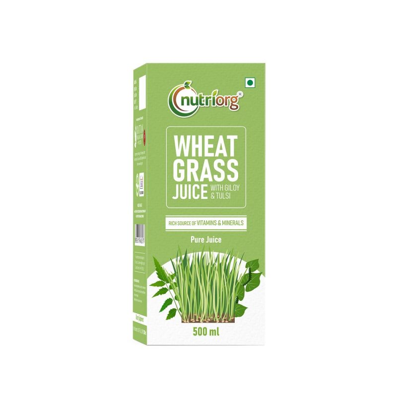 //php include('more-sellers.php'); ?>Nutriorg Wheat Grass Juice is a wonderful combination of herbs that include Wheat Grass, Giloy & Tulsi. Wheat Grass helps in detoxification, strengthens immune system and prevents constipation. Wheat grass is instantly absorbed into the blood stream and is considered to give prompt energy. Tulsi is a powerful antioxidant, Giloy juice helps to build immunity. Nutriorg Wheat grass juice is an effective healer due to its many minerals and vitamin contents. The juice also contains approximately 70% Chlorophyll which is an important blood generator. Wheat grass helps accelerate hemoglobin production.