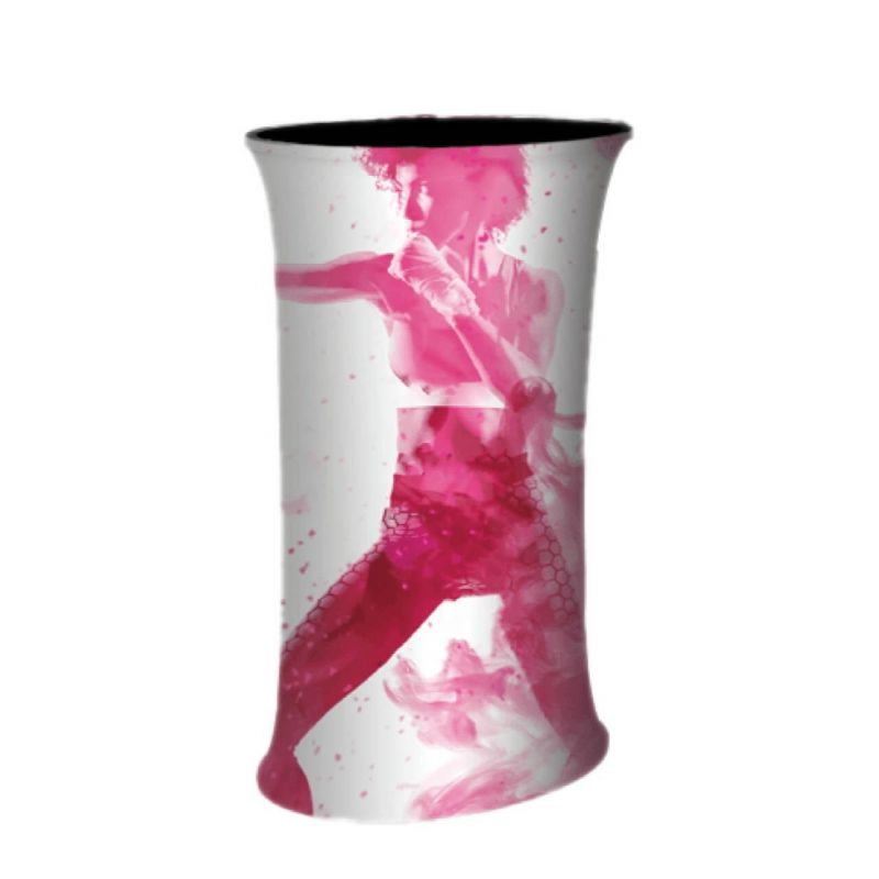 Oval-shaped promotional display stand designed to attract attention and showcase promotional materials.
