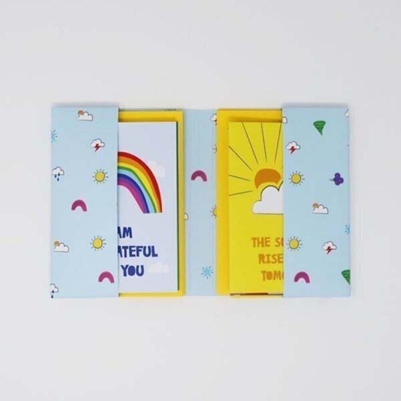 your life a real spark of joy and positivity! We’ve taken 10 illustrations from our Positive Doodle Diary and added some lovely positive messages: I am so grateful for you You are like sunshine to me You are a super star You make me so proud Storms don’t last forever The sun will rise again tomorrow I believe in you Sending you a massive hug You are so loved When it rains, look for rainbows. When it’s dark, look for stars These notecards are just lovely for the children in your life to send or receive. But if we’re honest, we think they’re so fab adults will want them too! Each pack contains 10 notecards. The insides are blank for your own message and they come with matching yellow envelopes. Additional Information Cards: approx. 14.5 x 10.5 cm Box: approx. 16.5 x 12 x 2 cm 10 x notecards |