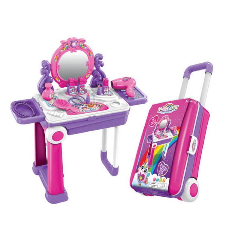 Versatile 3-in-1 playset transforms into a suitcase or makeup table.