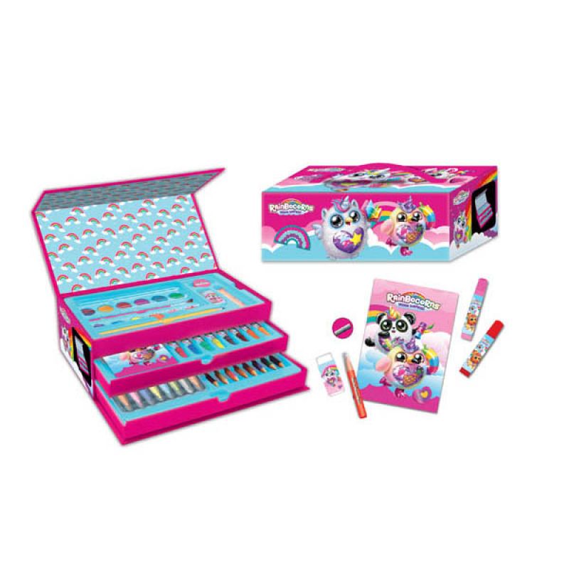 Rainbocorns coloring case, a beautiful box full of vibrant bright colors, and a coloring book. This coloring case set comes with a perfectly organised multi-layer tray. These adhesive colors are made of high-quality material and are sticky- free, and odourless. The premium pack of color pencils, sketches,paints and other complementary accessories are convenient  to carry wherever you want. Rainbocorns coloring pages give you the best experience in coloring.