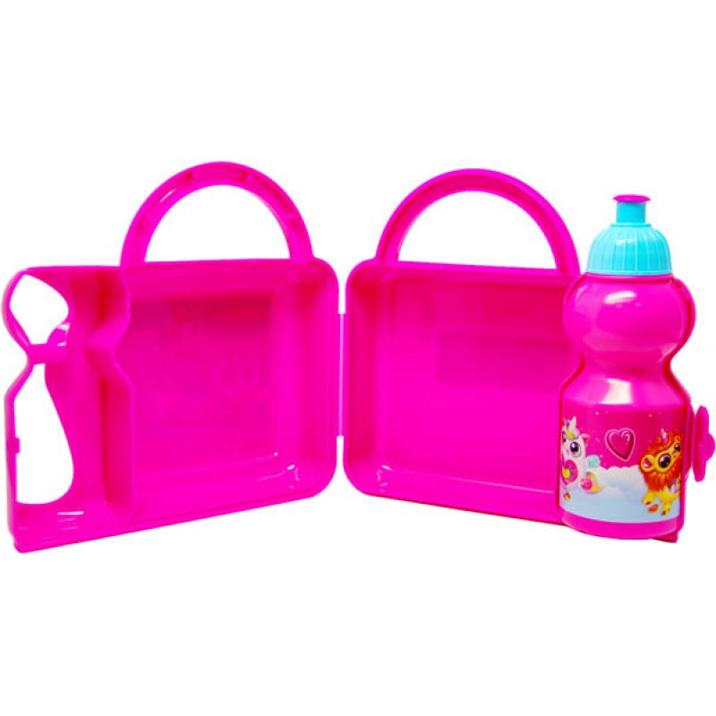 A water bottle is integrated into the Rainbocorns combo set. This kid's lunch box and bottle set have a distinctive design that makes it look like a suitcase that can be carried using the carrying handle that is attached to the kid’s lunch box.