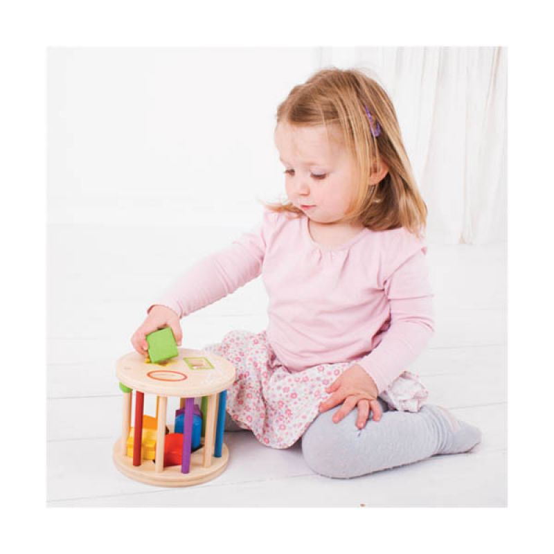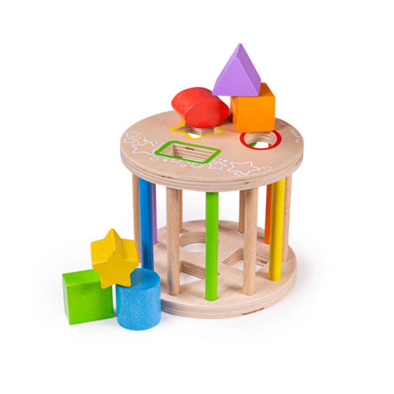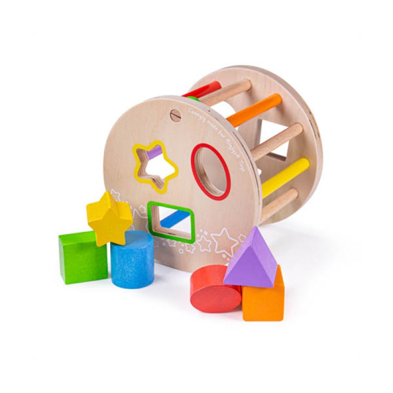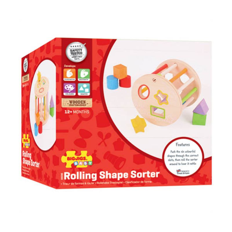 Slot the colourful wooden shapes through the correct slot on the top of this Rolling Shape Sorter. Once full, this unique wooden shape sorter can be rolled along to hear all of the shapes rattle around inside! Consists of 7 play pieces. Features a spoke that slides open for easy access to the shapes. Helps to develop dexterity and co-ordination. helps them to develop their dexterity and fine motor skills. Age: 1 Year+ Product dimensions: 15 x 12.5 x 15cm Made from high quality, responsibly sourced materials. Conforms to current European safety standards.