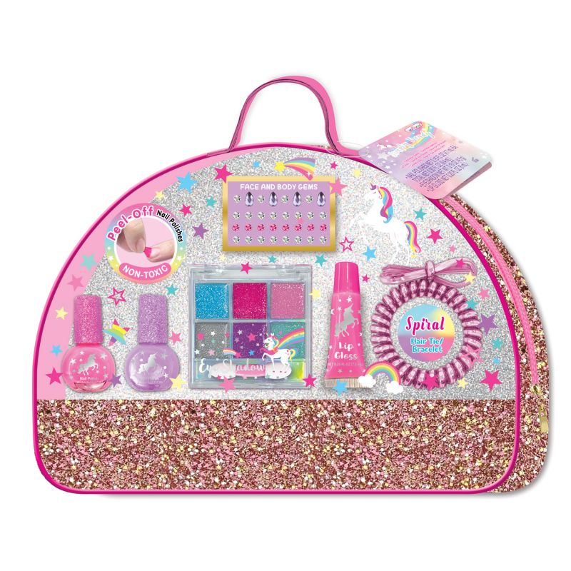 //php include('more-sellers.php'); ?>The glamour makeup kt is a must have for any girl. The reusable storage case is great for organizing all your cosmetics and beauty products. Includes: 2xNailpolishes, 1xFace&body gems sheet, 1xSpiral tie/bracelet, 1xLipgloss, 1xEyeshadow palette with brush
