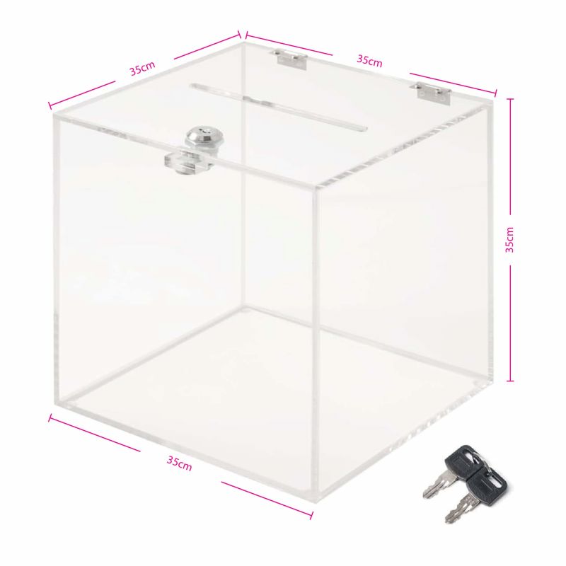 அதன் வெளிப்படையான அமைப்பு பங்கேற்பாளர்களை உள்ளடக்கங்களைப் பார்க்க அனுமதிக்கிறது, தேர்தல்கள், போட்டிகள் அல்லது நன்கொடை இயக்கங்களின் போது வெளிப்படைத்தன்மை மற்றும் நேர்மையை ஊக்குவிக்கிறது. 35 செ.மீ அளவிடும், இது வாக்குச்சீட்டுகள், உறைகள் அல்லது நன்கொடை சீட்டுகளுக்கு போதுமான இடத்தை வழங்குகிறது, இது அலுவலகங்கள், பள்ளிகள், கண்காட்சிகள் மற்றும் தொண்டு நிகழ்வுகளுக்கு ஏற்றதாக அமைகிறது.