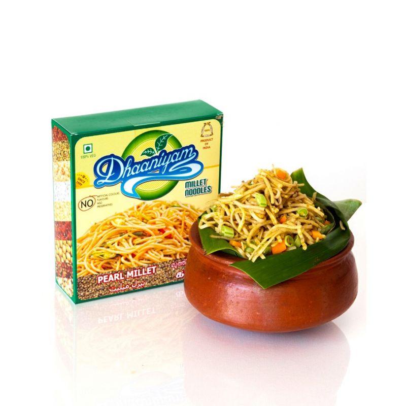 தானியம் முத்து தினை நூடுல்ஸ் என்பது வழக்கமான கோதுமை நூடுல்ஸுக்கு ஒரு சுவையான மற்றும் ஆரோக்கியமான மாற்றாகும். மிகச்சிறந்த தரமான முத்து தினை மாவு மற்றும் இயற்கை பொருட்களால் தயாரிக்கப்படும் இந்த நூடுல்ஸ் ஆரோக்கியமான வாழ்க்கை முறைக்கு அவசியமான ஊட்டச்சத்துக்களால் நிரம்பியுள்ளது. முத்து தினை புரதம், நார்ச்சத்து மற்றும் தாதுக்களின் வளமான மூலமாகும், இது நல்ல ஆரோக்கியத்தை ஊக்குவிக்கும் ஒரு சூப்பர்ஃபுட் ஆகும். நூடுல்ஸ் ஒரு தனித்துவமான சுவை மற்றும் அமைப்பைக் கொண்டுள்ளது, இது உங்கள் சுவை மொட்டுகளைத் தூண்டும் மற்றும் மேலும் ஏங்க வைக்கும். தானியம் முத்து தினை நூடுல்ஸ் சமைக்க எளிதானது மற்றும் ஒரு முழுமையான உணவாக அல்லது உங்களுக்கு பிடித்த சாஸ் அல்லது கிரேவியுடன் அனுபவிக்க முடியும்.