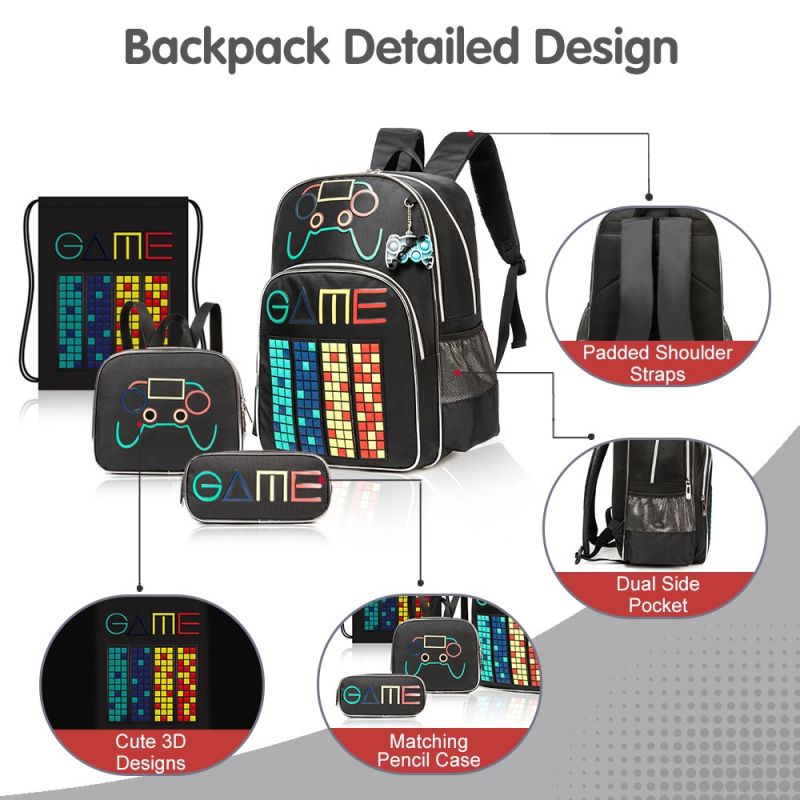 4IN1 ஒருங்கிணைக்கப்பட்டது: 4 இன் 1 கேமர் பேக்பேக்குடன், நீங்கள் 1 பையுடனும், 1 டிராஸ்ட்ரிங் பேக், 1 லஞ்ச் பாக்ஸ், 1 பென்சில் கேஸைப் பெறுவீர்கள்.