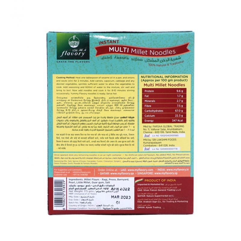 ஆரோக்கியமான, சுவையான மற்றும் திருப்தி! ஃப்ளேரி பசையம் இல்லாத மல்டி மில்லட் நூடுல்ஸுடன் ஆரோக்கியம் மற்றும் சுவையின் சரியான கலவையை சுவைக்கவும். சிறுதானியங்களின் சத்தான கலவையிலிருந்து வடிவமைக்கப்பட்ட இந்த நூடுல்ஸ் உங்கள் உணவுக்கு சுவையான ஆரோக்கியமான விருப்பத்தை வழங்குகிறது. பசையம் இல்லாத, அவை உணவுக் கட்டுப்பாடுகளைக் கொண்ட நபர்களைப் பூர்த்தி செய்கின்றன, எல்லோரும் திருப்திகரமான நூடுல் உணவை அனுபவிக்க முடியும் என்பதை உறுதி செய்கின்றன. நீங்கள் விரைவான அசை-வறுக்கவும் அல்லது இதயம் நிறைந்த சூப்பைத் தயாரிக்கிறீர்களோ, ஆரோக்கியமான மற்றும் சுவையான உணவு அனுபவத்திற்கு சுவை பசையம் இல்லாத மல்டி மில்லட் நூடுல்ஸ் சிறந்த தேர்வாகும். சுவையான பசையம் இல்லாத மல்டி மில்லட் நூடுல்ஸ் - 175 கிராம் - ஆரோக்கியமான மற்றும் சுவையான நூடுல்ஸ் விவரக்குறிப்புகள்: பிராண்ட் சுவை பொருளின் வகை இலவச மல்டி மில்லட் நூடுல்ஸ் நிகர எடை கிராம் 175 பிறந்த நாடு துபாய், ஐக்கிய அரபு எமிரேட்ஸ்