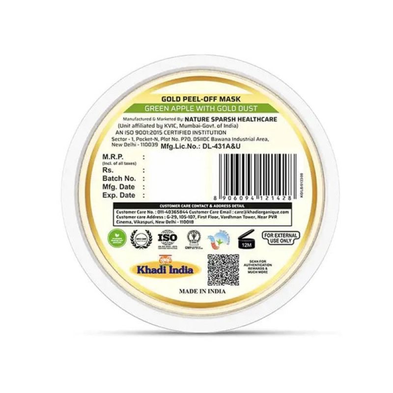 காதி ஆர்கானிக் கோல்ட் பீல்-ஆஃப் மாஸ்க் (தங்க தூளுடன் கூடிய பச்சை ஆப்பிள்) 50 கிராம்