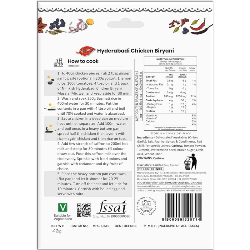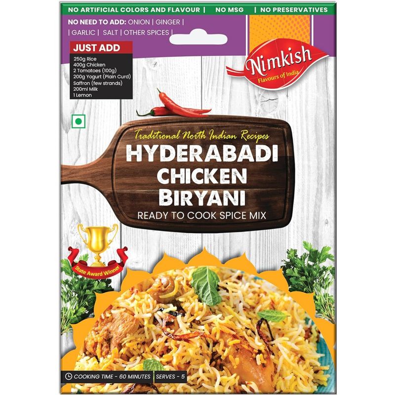 1. 400 கிராம் சிக்கன் துண்டுகளாக, 30 கிராம் (2 டேபிள்ஸ்பூன்) இஞ்சி பூண்டு விழுது (விரும்பினால்), 200 கிராம் தயிர், 1 எலுமிச்சை சாறு, 100 கிராம் தக்காளி, 40 மில்லி எண்ணெய் (3 டேபிள்ஸ்பூன்) மற்றும் 1 பேக் - 30 கிராம் நிம்கிஷ் ஹைதராபாதி சிக்கன் பிரியாணி மசாலா ஆகியவற்றை தேய்க்கவும். நன்றாக கலந்து 30 நிமிடங்கள் ஒதுக்கி வைக்கவும்.