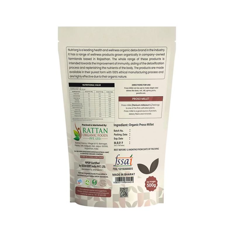 //php include('more-sellers.php'); ?>நியூட்ரியார்க் ஆர்கானிக் புரோசோ தினை என்பது அதிக சத்தான மற்றும் பல்துறை தானியமாகும், இது பல நூற்றாண்டுகளாக இந்திய உணவு வகைகளில் பிரதானமாக உள்ளது. இந்த தினை இயற்கையாகவே பசையம் இல்லாதது, இது பசையம் உணர்திறன் அல்லது செலியாக் நோய் உள்ளவர்களுக்கு ஒரு சிறந்த தேர்வாக அமைகிறது. இது உணவு நார்ச்சத்து, புரதம் மற்றும் இரும்பு மற்றும் மெக்னீசியம் போன்ற அத்தியாவசிய தாதுக்களிலும் நிறைந்துள்ளது. இந்த தினை லேசான மற்றும் சற்று சத்தான சுவை கொண்டது, இது சூப்கள், குண்டுகள் மற்றும் கஞ்சிகளுக்கு சரியான கூடுதலாகிறது. பிரியாணி அல்லது சாலடுகள் போன்ற உணவுகளில் அரிசி அல்லது குயினோவாவுக்கு இது ஒரு சிறந்த மாற்றாகும்.